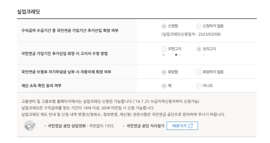 나의 경우 구직급여 수급기간 중 국민연금 가입기간 추가산입을 희망함으로 체크했었고, 제대로 신청된 것으로 체크되어 있었다.