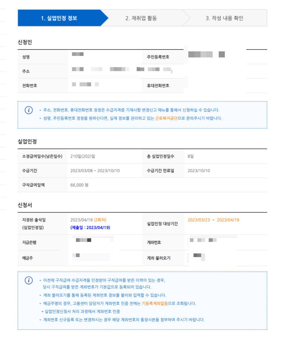 - 3월 23일(목) : 1차 구직급여 입금(8일분)