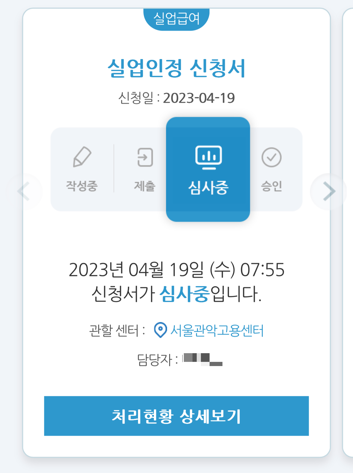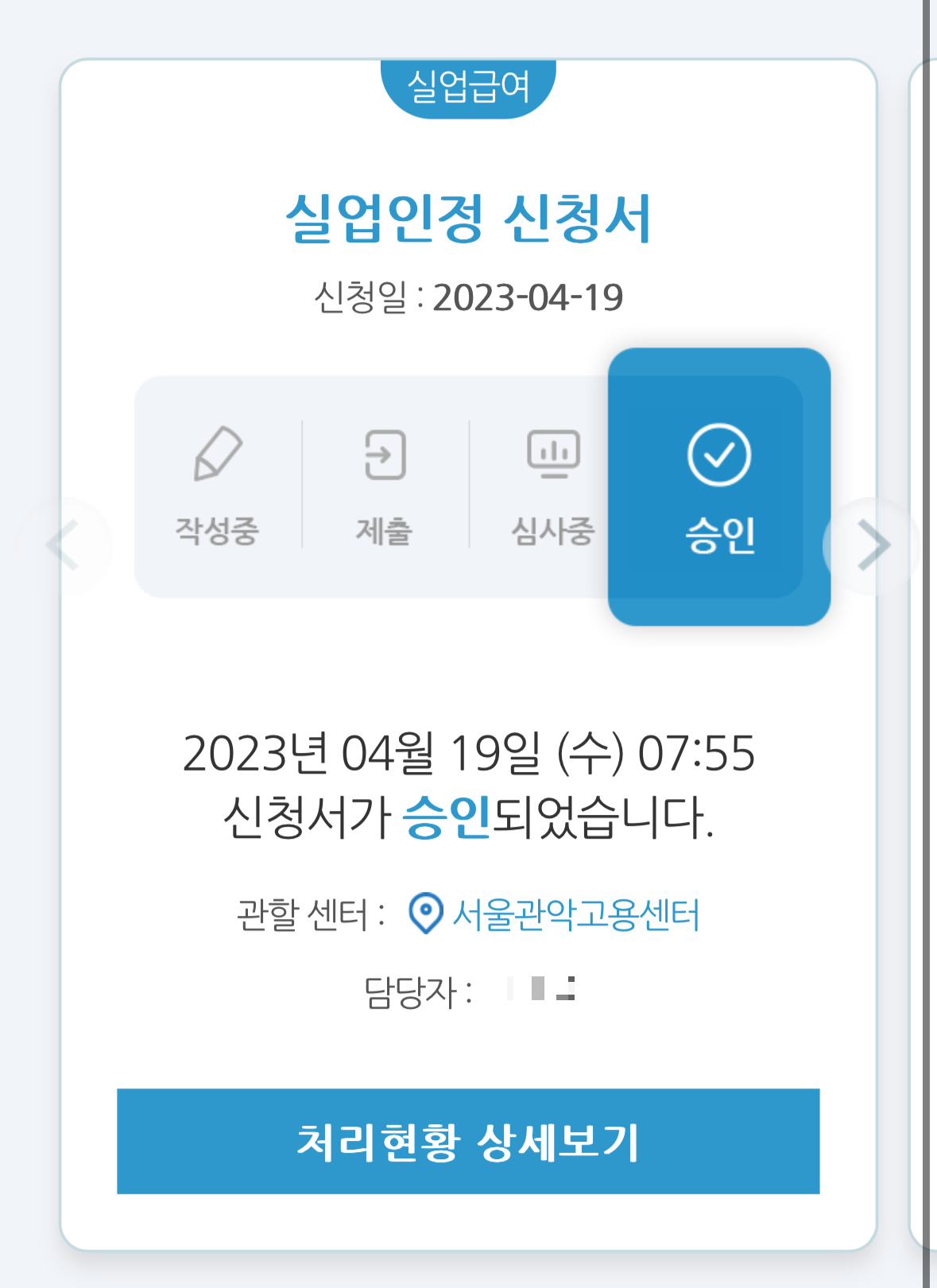 다음날 아침에 체크했을 때도 심사중으로 떴는데, 실업급여 입금된 거 보고 궁금해서 확인했는데 승인 상태로 바뀌어 있었음.