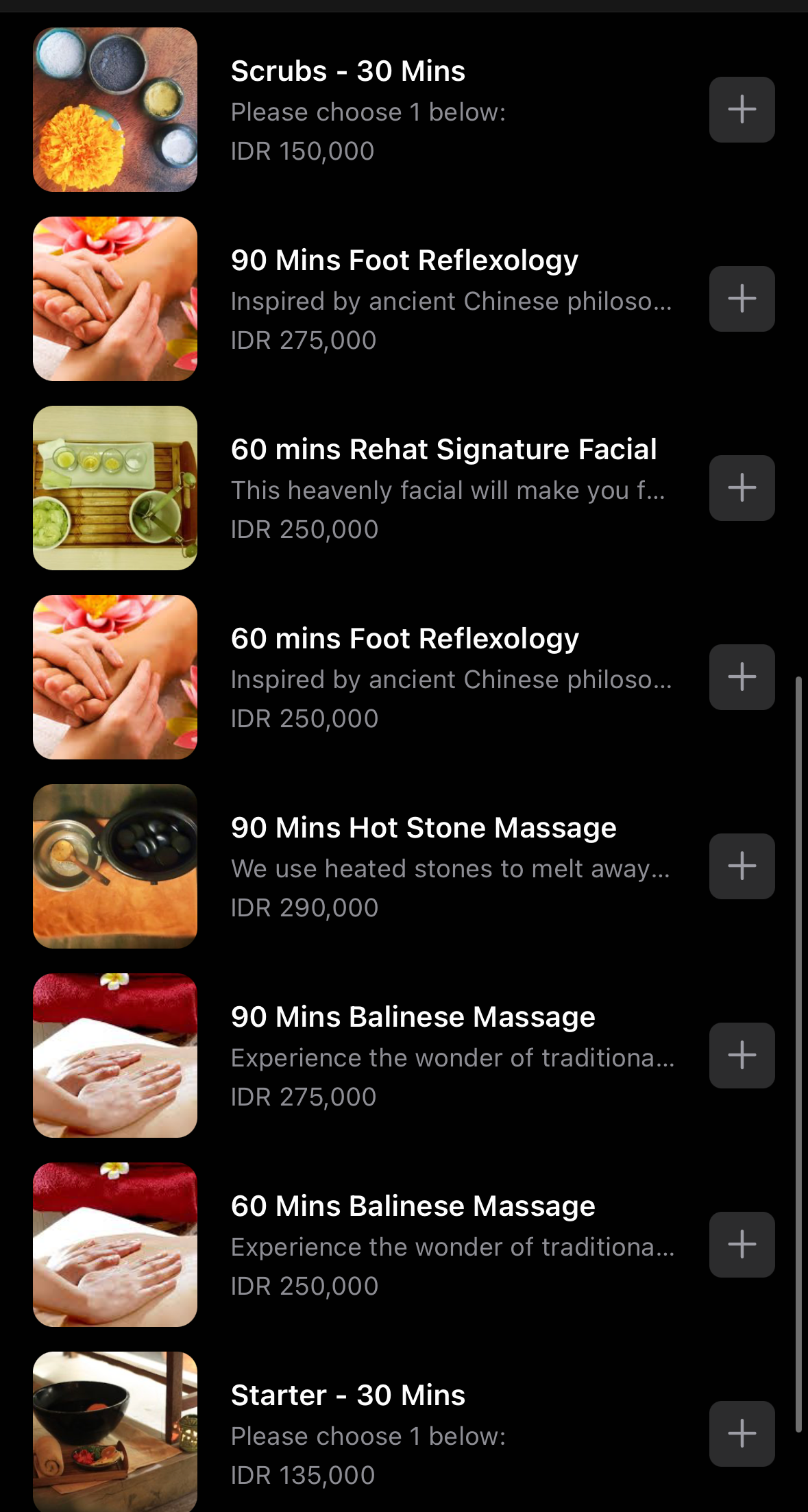나는 120분 스파 메뉴로 골랐고, 35만 루피아(3만원 정도)였음.