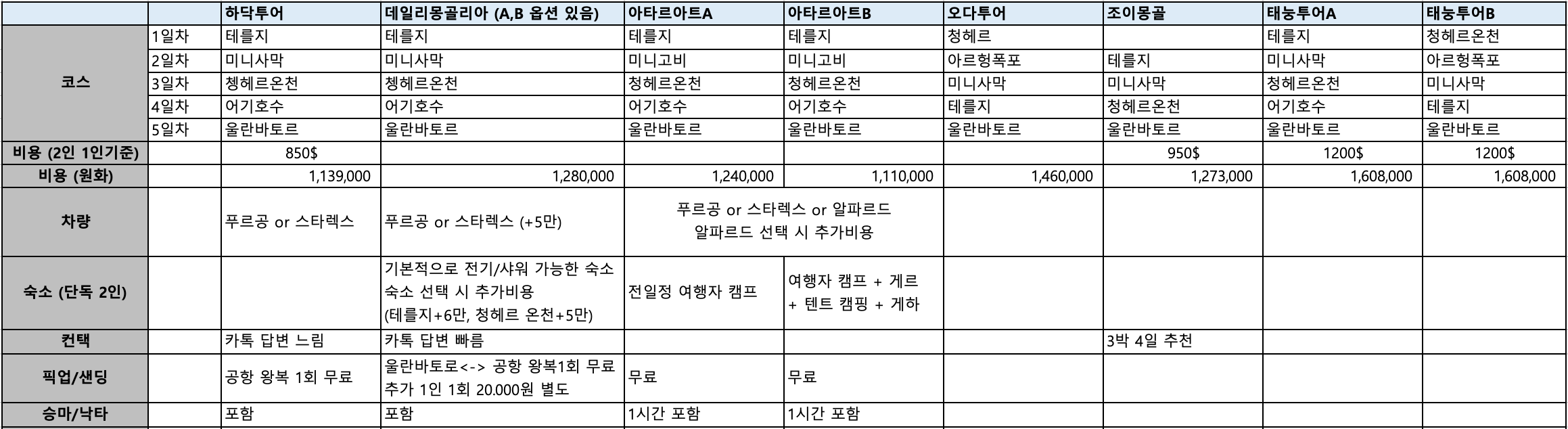 나는 하닥투어, 데일릴몽골리아, 아타르아트, 오다투어, 조이몽골, 태눙투어 등을 알아봤었다.