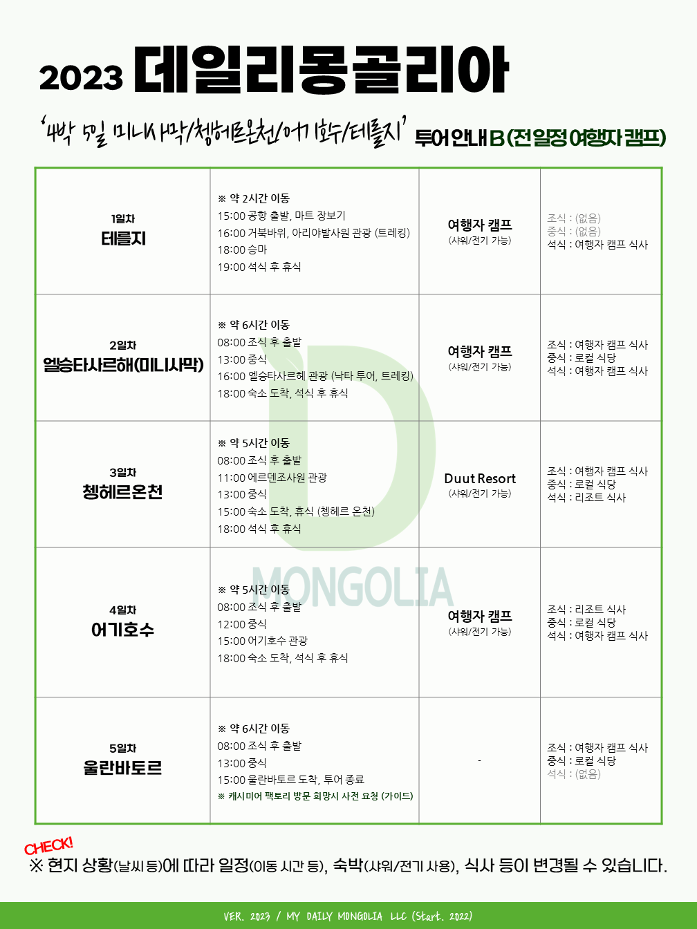 아래는 데일리몽골리아에서 내 일정에 맞추어 기존 일정을 조금 수정해준 세부 여행표.