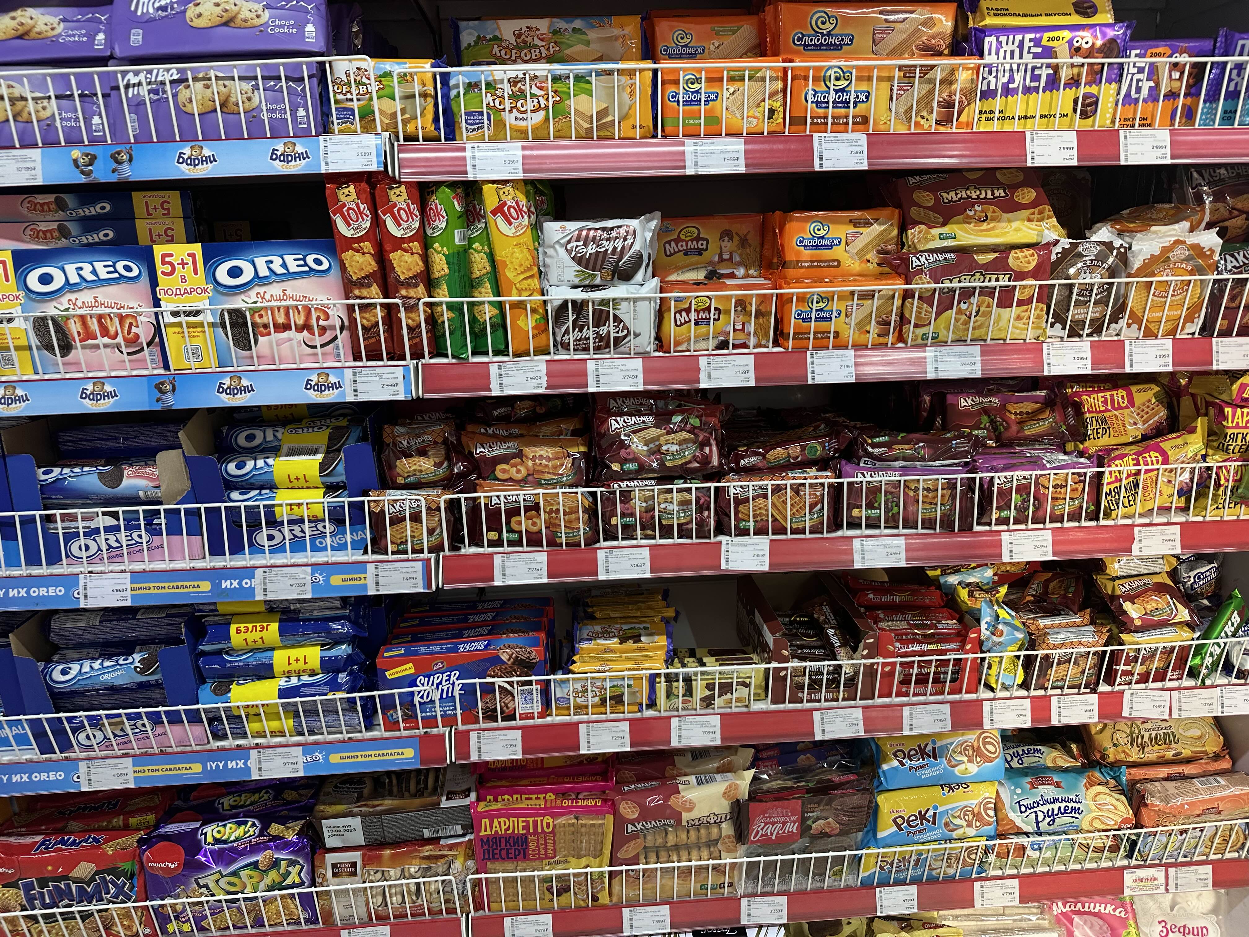 평소에 과자를 잘 안먹는 편인데 몽골 와서 진짜 많이 먹었다. 혹시나 심심할까봐 주전부리로 샀는데, 차에서 이동 시간이 길다 보니 하나 둘 까먹다 보면 시간 가는 줄 모른다. 몽골 자체의 과자는 별로 없고, 거의 수입산이다. 러시아가 가깝다 보니 러시아 과자도 많다.