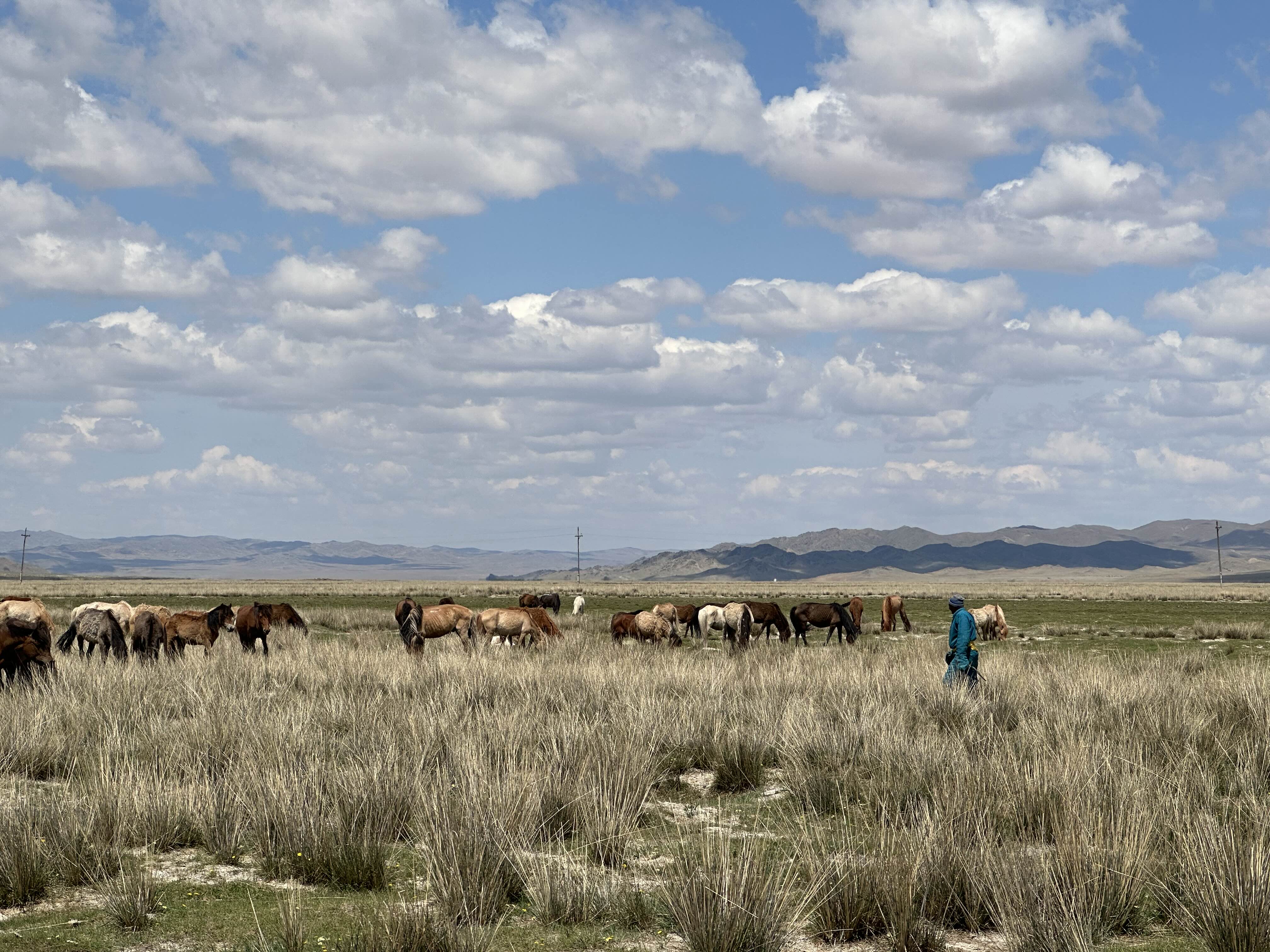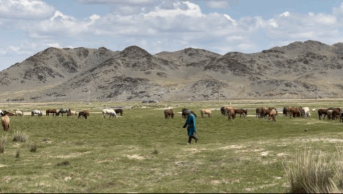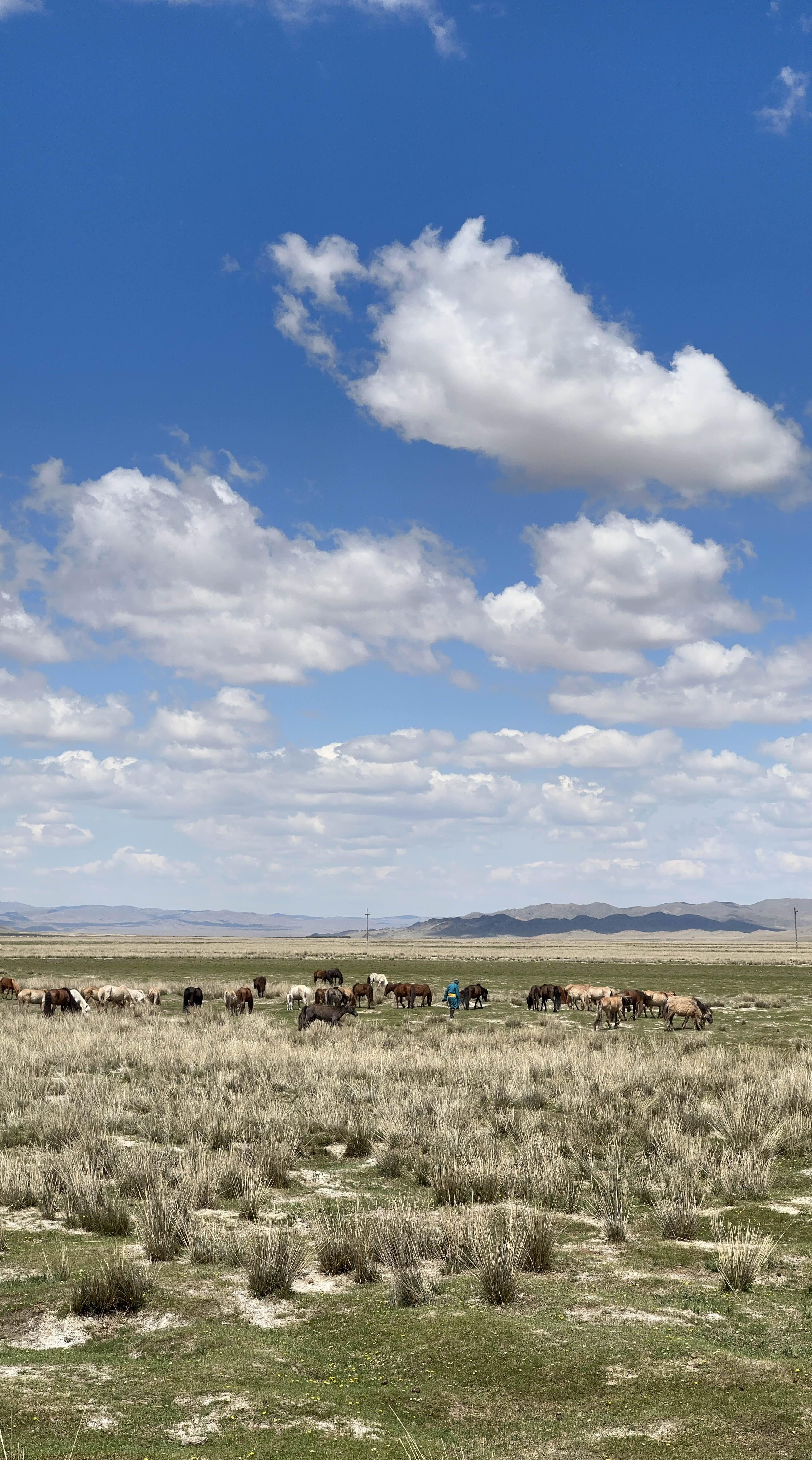 무슨 다큐멘터리 영화 찍고 있는 것 같다고 느껴졌던 몽골 초원의 풍경. 몽골 전통옷을 입은 현지인이 지나가니 진짜 영화다. 근데 말의 경우에는 약간 위험할 수도 있다고 해서 가까이 가지는 못했다. 양이나 소는 겁이 많아서 그런지 스멀스멀 알아서 피하는 편인데, 말은 덩치도 그렇고 잘못하면 위험할 수도 있는 것 같았다.