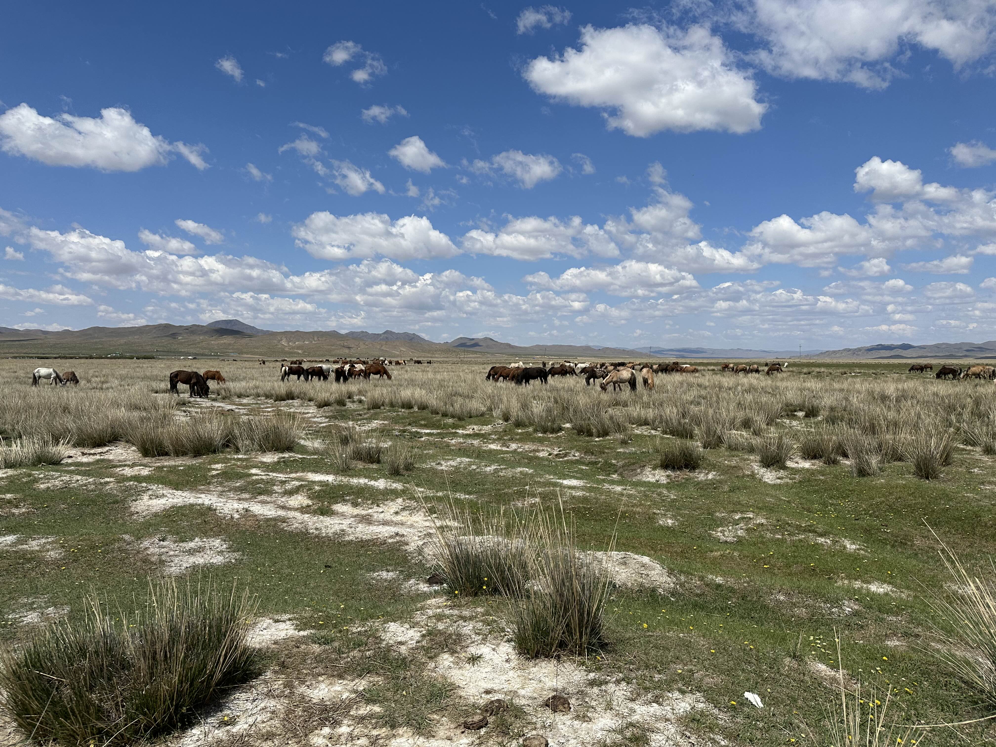 몽골 여행 하면서 사람보다 양을 더 많이 봤다. 처음엔 우와 우와 하면서 봤지만 나중에는 슬쩍만 지켜보게 됨. 양, 소, 말 등 길에 있는 동물들은 다 주인이 있는 거라고 한다. 자세히 보면 목걸이를 한다던지 몸에 표시가 되어 있는 경우도 있다. 조금 아쉬웠던 건 6월 초는 아직 풀이 많이 자라지 않아서 동물들이 예쁘게 털 찐(?) 시기는 아니라고 한다. 그래서 약간 마르고 털이 듬성듬성 있다.