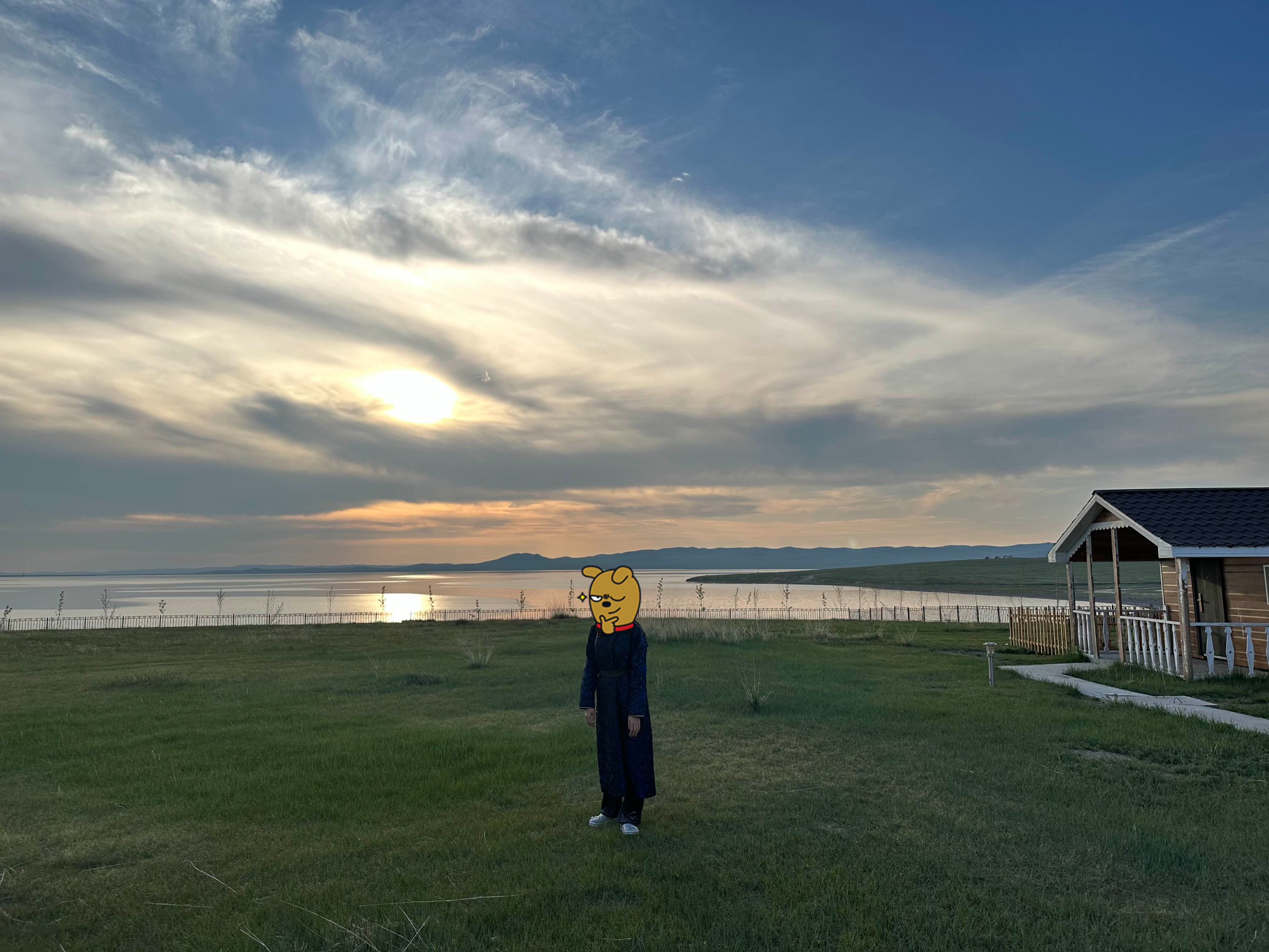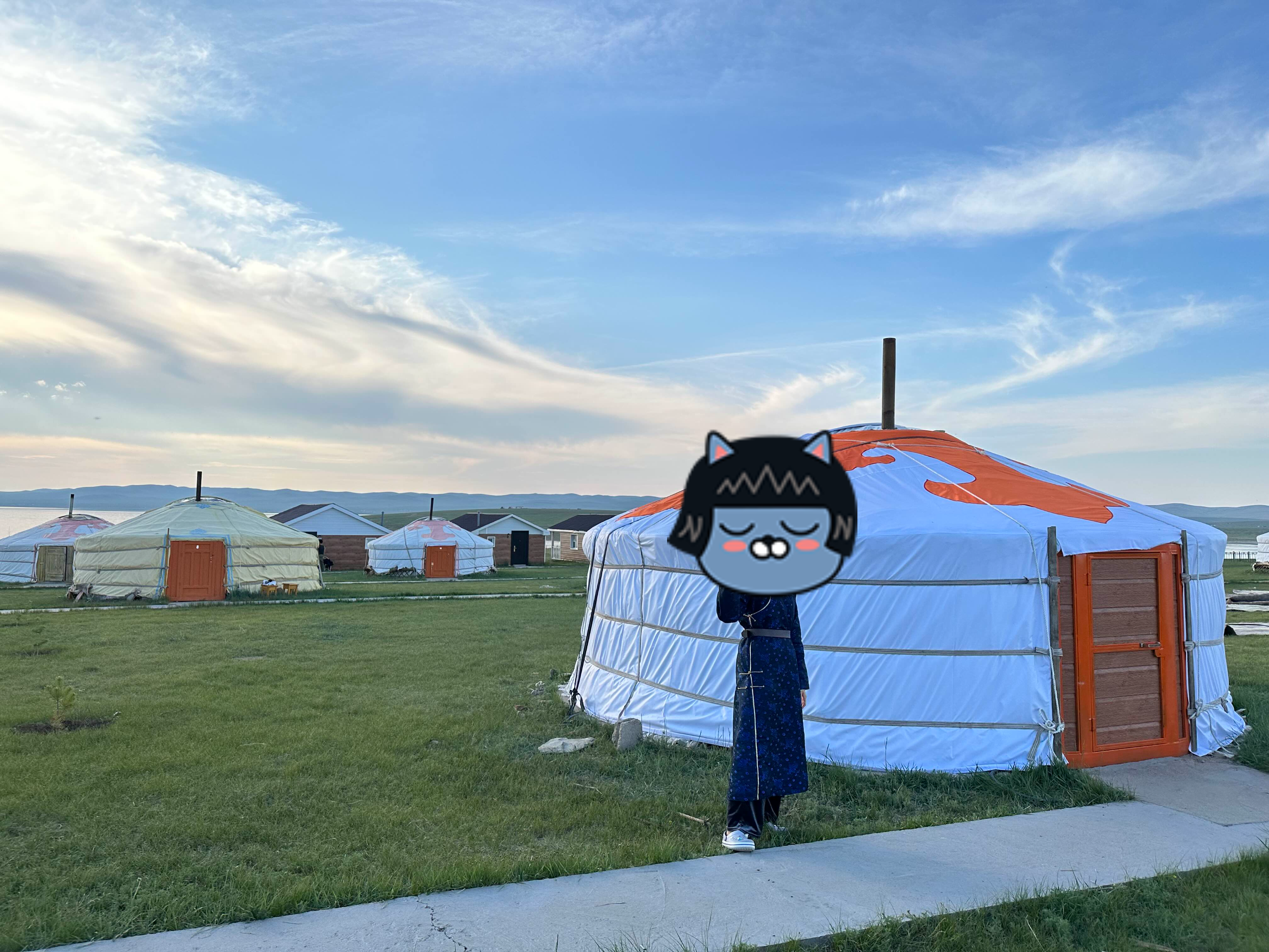 해가 높게 떠있을 때는 벌레가 더 많은 것 같아서 살짝 저녁쯤에 다시 주변 산책을 시작했다. 숙소에서 바라본 주변 경관과 저 멀리 보이는 어기호수. 가이드님이 몽골 전통 의상을 빌려주셔서 여기저기 사진 찍고 놀았다. 가이드님은 잠옷으로 쓰신다고 했다. 몽골 전통 옷을 입은 사람이 종종 보이기는 하는데, 거의 시골 어르신들 한정인 것 같았다.