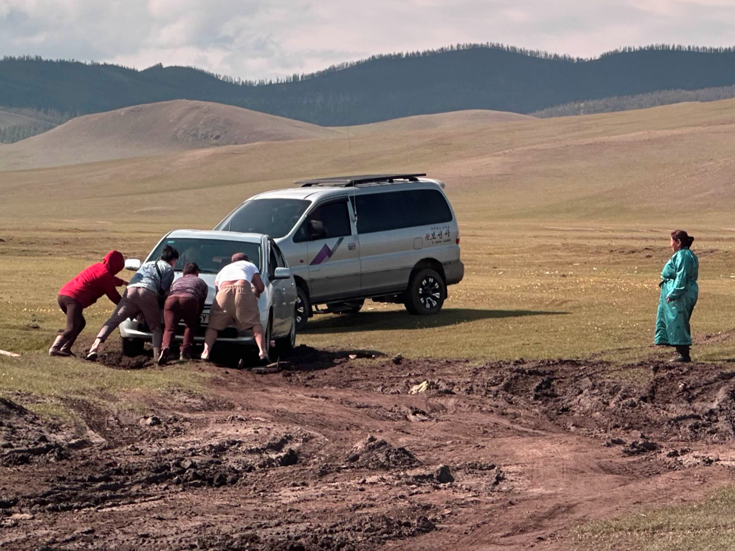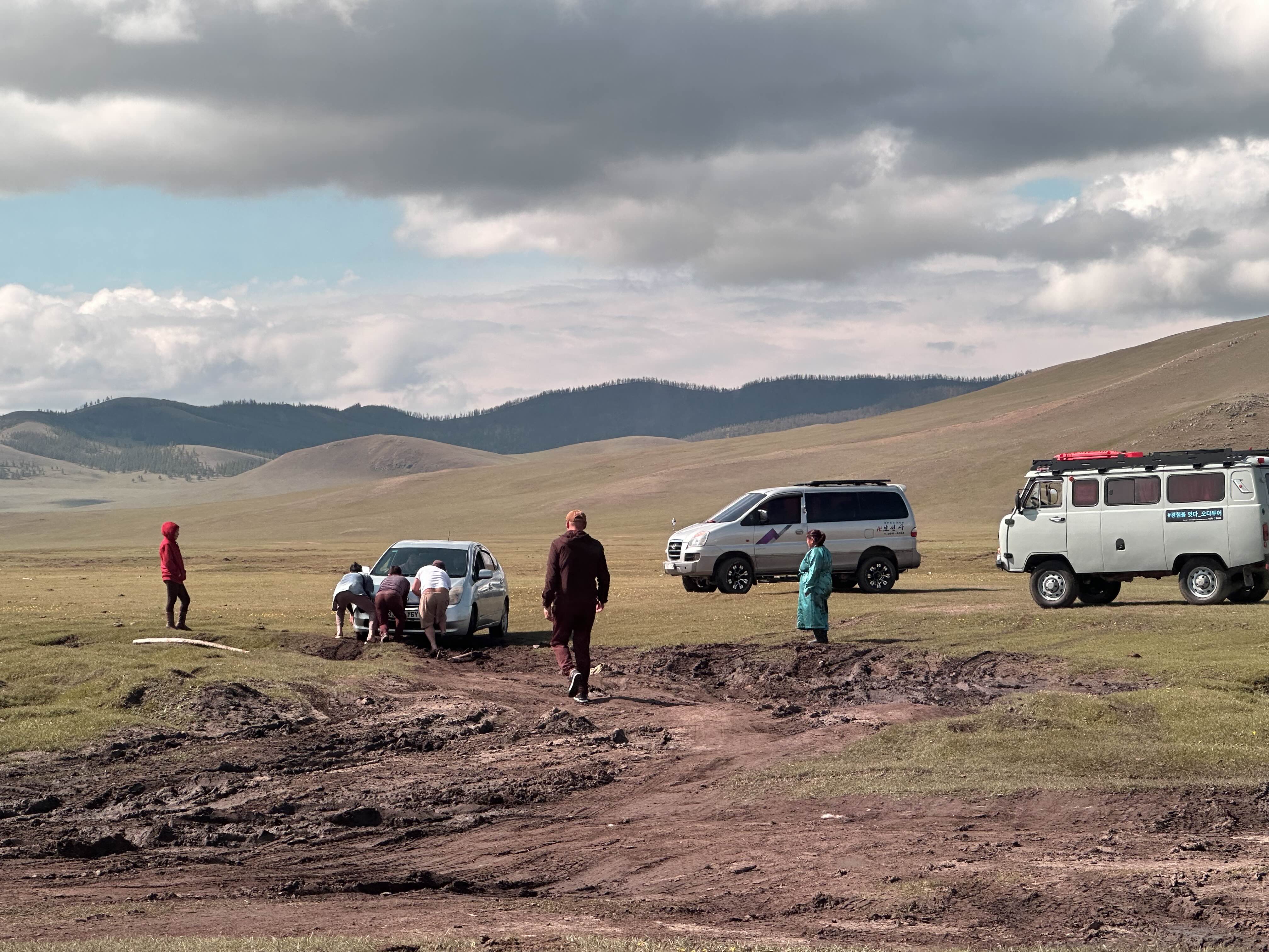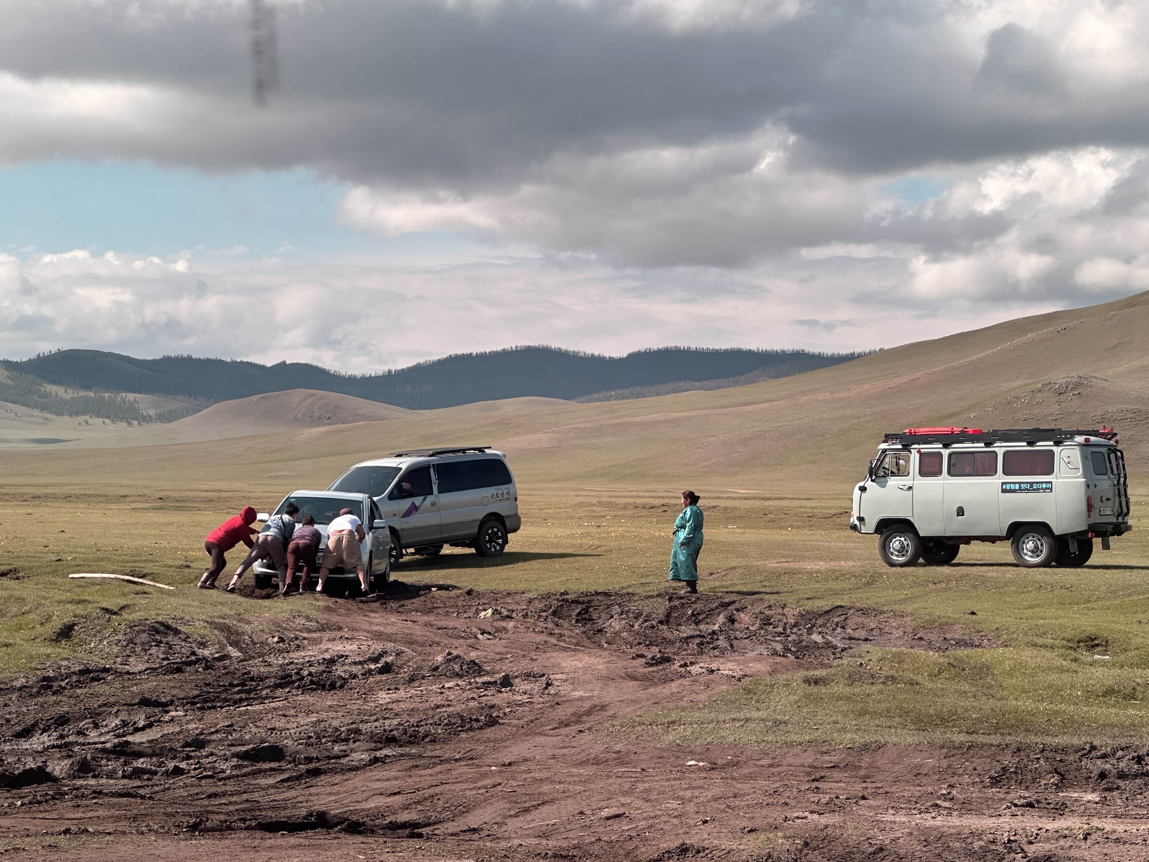 다른 기사님들을 많이 만난 건 아니지만, 운전하는 솜씨를 보면 우리와 여행한 기사님은 꽤나 베테랑이신 것 같았다. 위험해 보이는 길도 한 번도 빠진 적 없이 기어 조절을 하시면서 운전을 잘하셨다. 승용차의 앞바퀴가 빠져서 오도 가도 못하는 상황이었고, 지나가던 승합차와 푸르공도 멈춰 서서 같이 도왔다. 진흙에 빠진 승용차는 몽골 현지인 가족들로 추정됐다. (현지인들도 운전하기 쉽지 않은 몽골...)