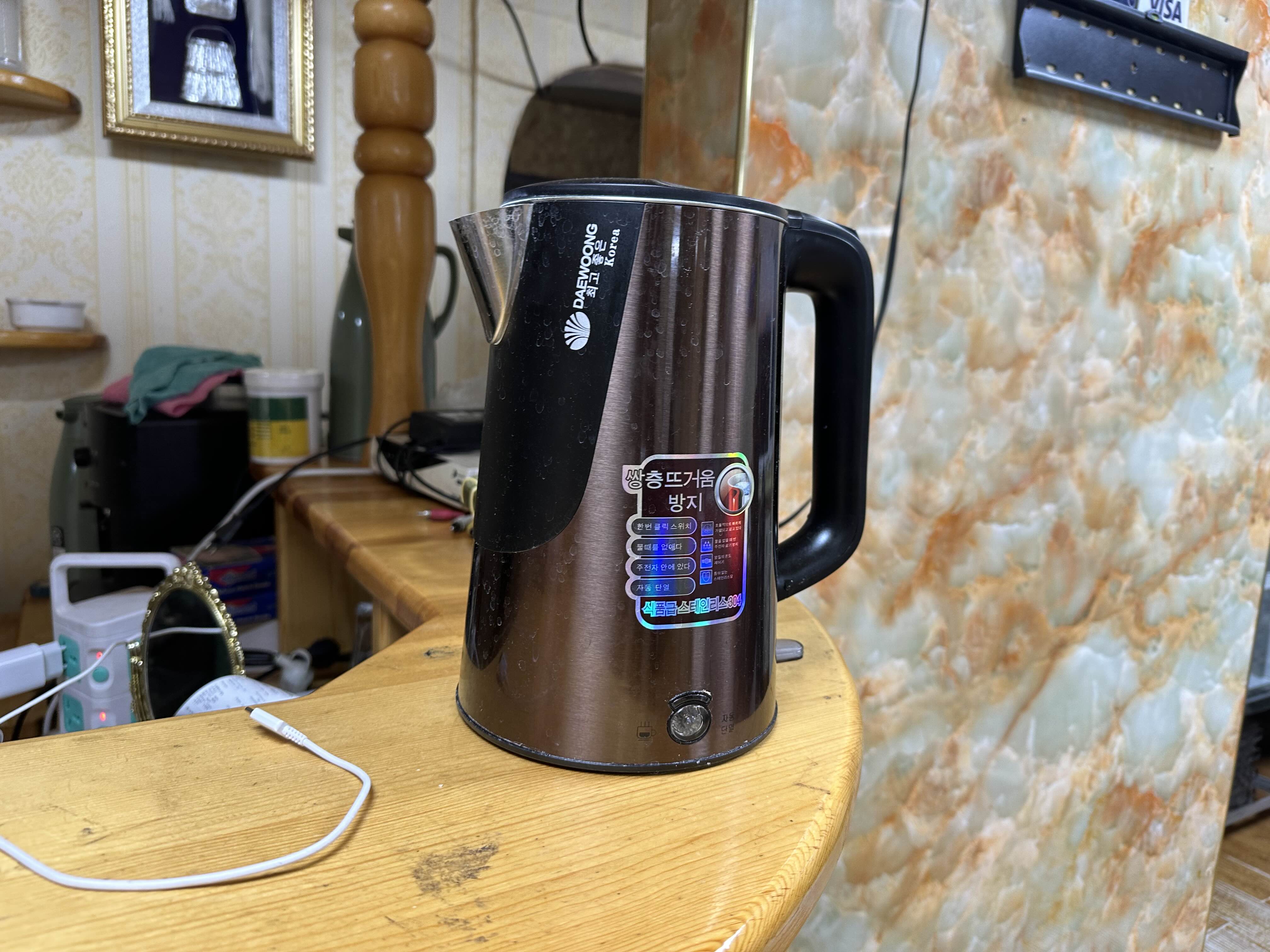 점심이 약간~ 부실한 느낌이었고 몽골 일몰 보면서 컵라면 먹으면 딱 알맞을 쌀쌀한 온도였다. 그래서 컵라면을 먹으려고 식당에 뜨거운 물을 요청했는데, 한국제품인척 하는 중국제품이 있어서 웃겼다. 가이드님이 알려준 '뜨거운 물 주세요(하롱 오쓰 아비)'를 하니까 이 전기포트를 가져다주셨는데, 누가 봐도 엉터리 한국어 스티커가 붙여있다. 아무래도 한국제품이 퀄리티가 좋다는 인식이 있다 보니 한국말 마구 번역한 스티커를 붙여서 판매하는 듯. '쌍층뜨거움방지'라... 제품 브랜드명도 '대우'를 흉내 낸 '대웅'임 ㅋㅋ (게다가 요새 대우가 어딨어요;)