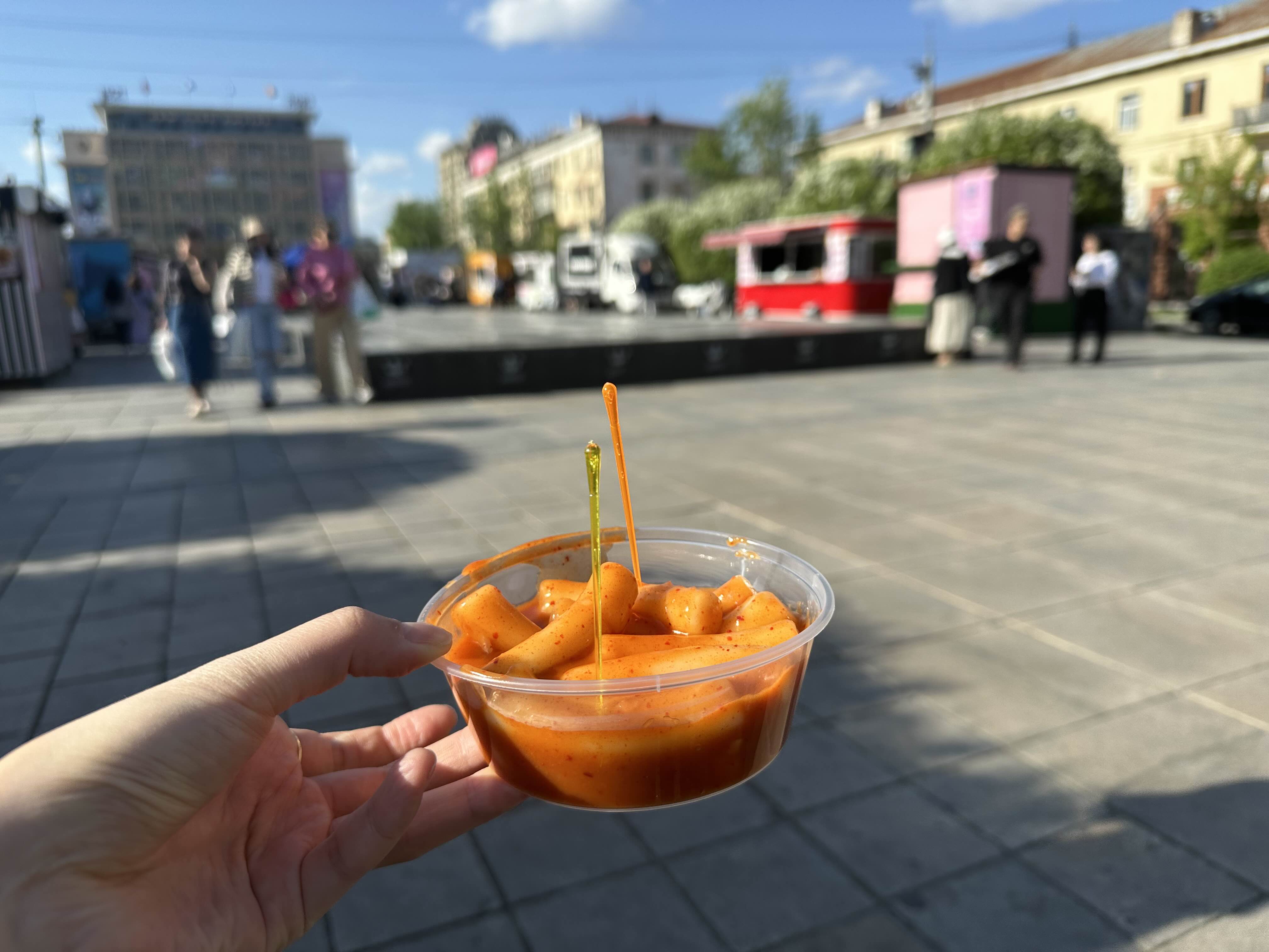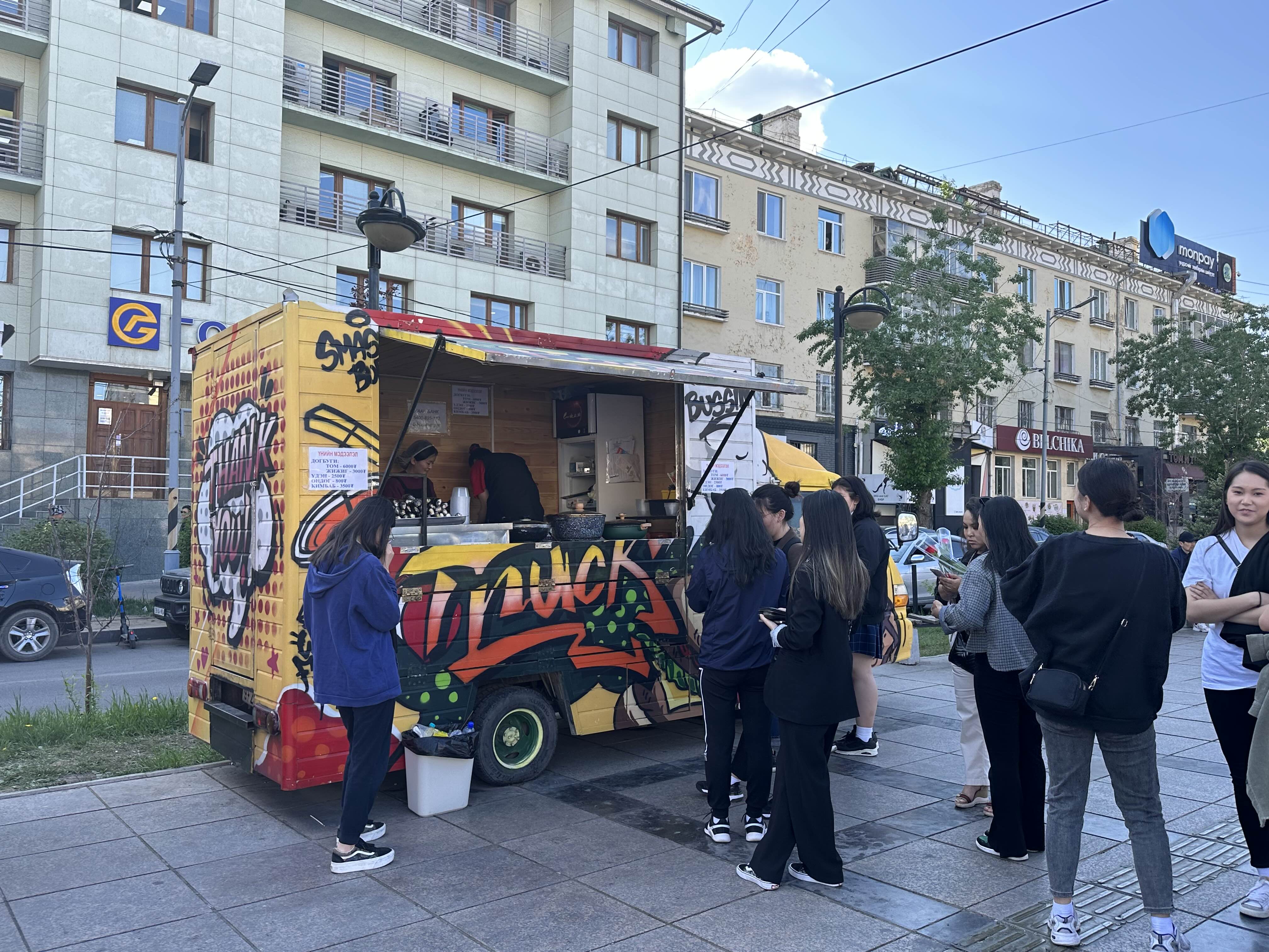 몽골 국영백화점 앞 광장에서 떡볶이를 팔고 있었다..! 그리고 젊은 사람들이 꽤나 줄을 서있는 모습. 마침 떡볶이 하나 먹으면 충전될 것 같아서 줄 서서 기다림. 다른 푸드트럭에 비해서 줄을 길게 서있는 모습. 이게 K-분식의 위엄.