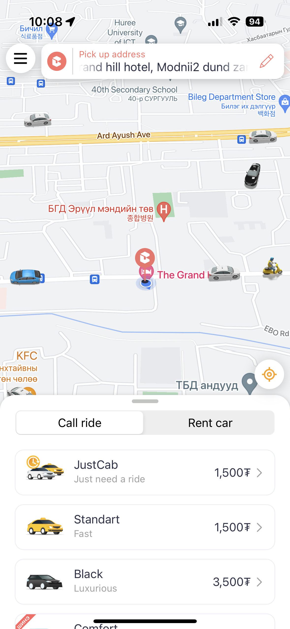 일반차에 손을 흔들어 잡는 몽골의 택시를 잡을 용기가 안나는 사람이라면 추천한다. 그렇게 잡으면 가격 흥정이라는 고난이 또 기다리고 있지만, 이렇게 앱을 이용하면 그냥 앱에 나오는 거리에 맞춰서 요금을 지불하면 된다. 단점은 비용에 일정 수수료가 좀 포함된다는 점이다. 리뷰에는 한국어 잘하는 택시 기사들 많다고 봤는데, 나는 운이 없을 수 있음을 명심해야 한다. ^^! 몽골에서 영어가 안 통하면 차라리 러시아어로 번역해서 보여주는 게 더 소통이 될 수도 있음. (나이 든 분들은 러시아어를 많이들 하신다.)