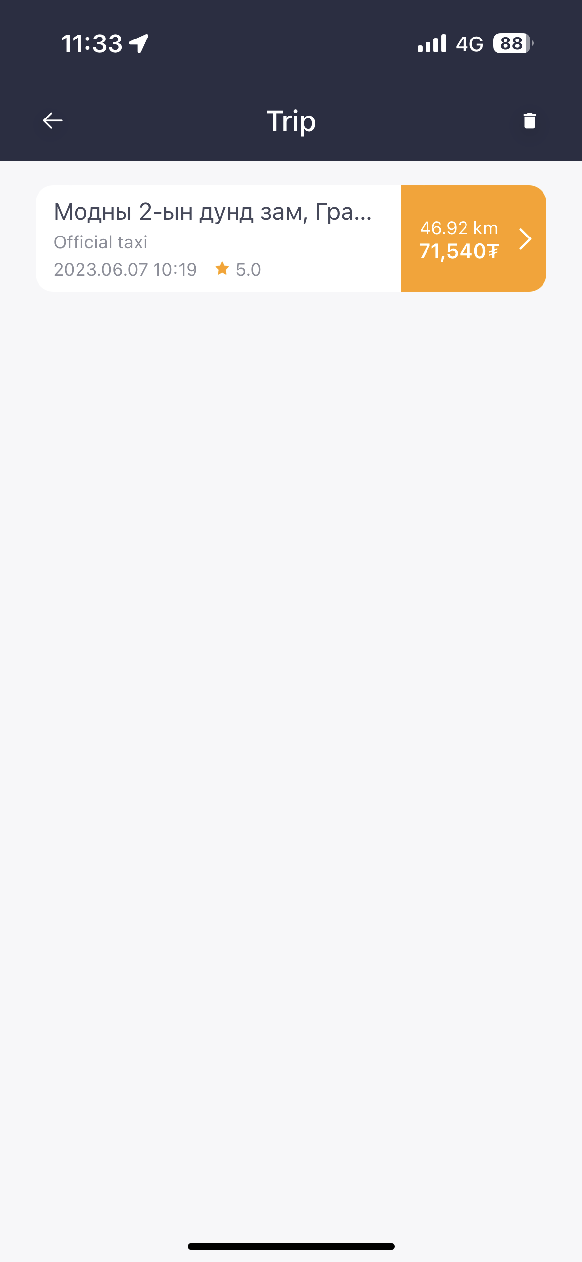 UBCab도 택시에 따라서 이용료와 수수료가 조금씩 다르다. 나는 제일 낮은 택시로 했고, 1KM당 1,500투그릭이었다. 근데 미터기에 따라서 요금만 내는 게 아니고, 택시별 등급별 수수료와 트래픽에 따른 일정 요금이 더 추가된다. 실제 돈은 조금 더 여유있게 준비해야 한다. 내가 지불한 금액은 아래와 같다. 잔돈이 없어서 72,000투그릭을 드렸다.