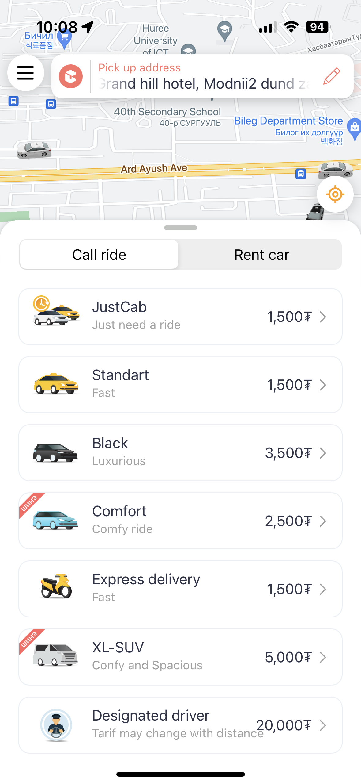 택시를 내 위치로 부르는 화면. 서비스별로 이용 금액이 상이하다. 가장 기본적인 금액은 1Km에 1,500투그릭.