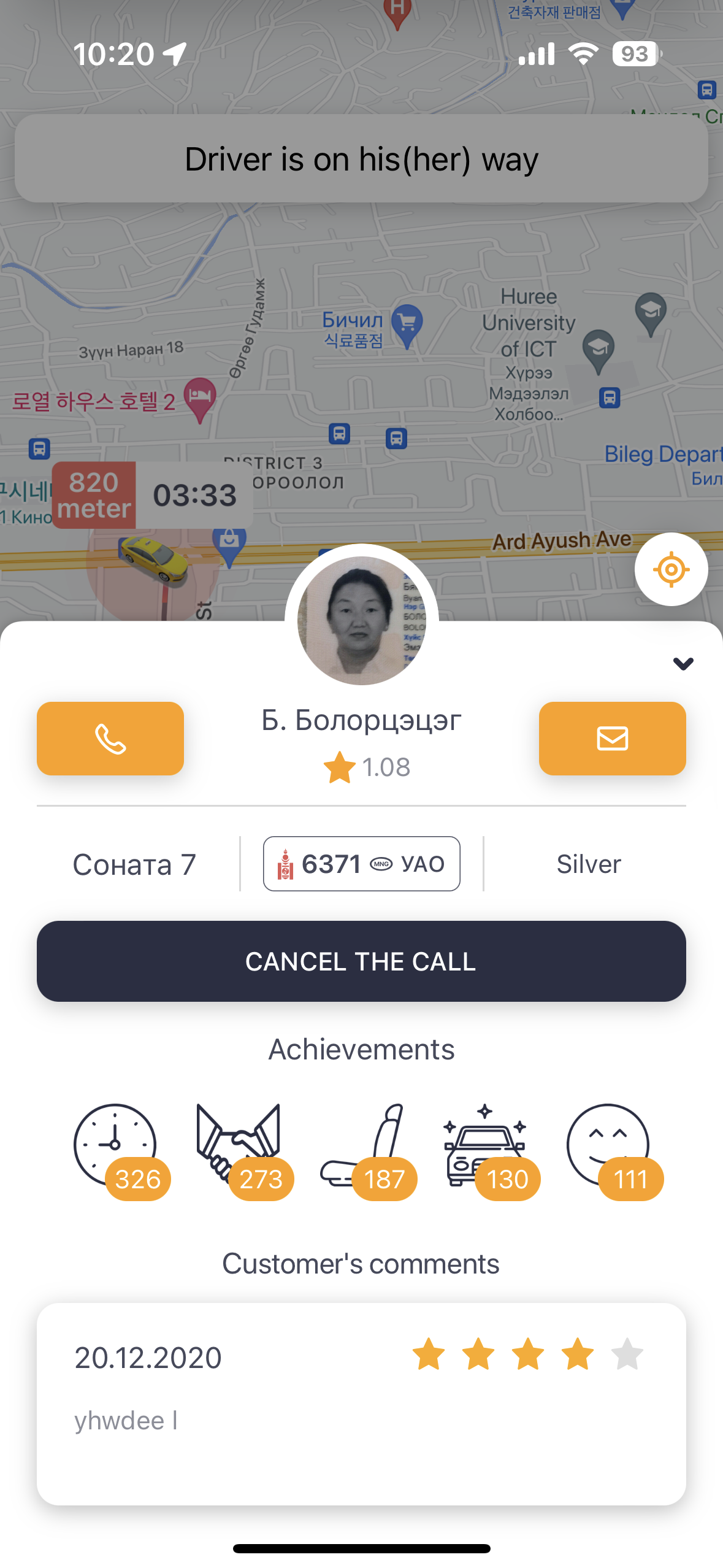 택시를 호출해서 오고 있는 화면. 기사님의 평점이 뜨는데 무려 ★1.08점인 기사님이 오고 계셨다. ㄷㄷ. 오고 있는 화면에서는 차 번호랑 간단한 정보가 나온다. 중간 화면 기준으로 하단에 보면 '6371'이라는 차번호를 알 수 있다. 차 색은 Silver. 아마 평점이 낮아서 걱정했지만, 뭐 별다를 것 없이 그냥 갔다. 영어로 에어포트도 소통이 되지 않았던 점이 가장 힘들었음.
