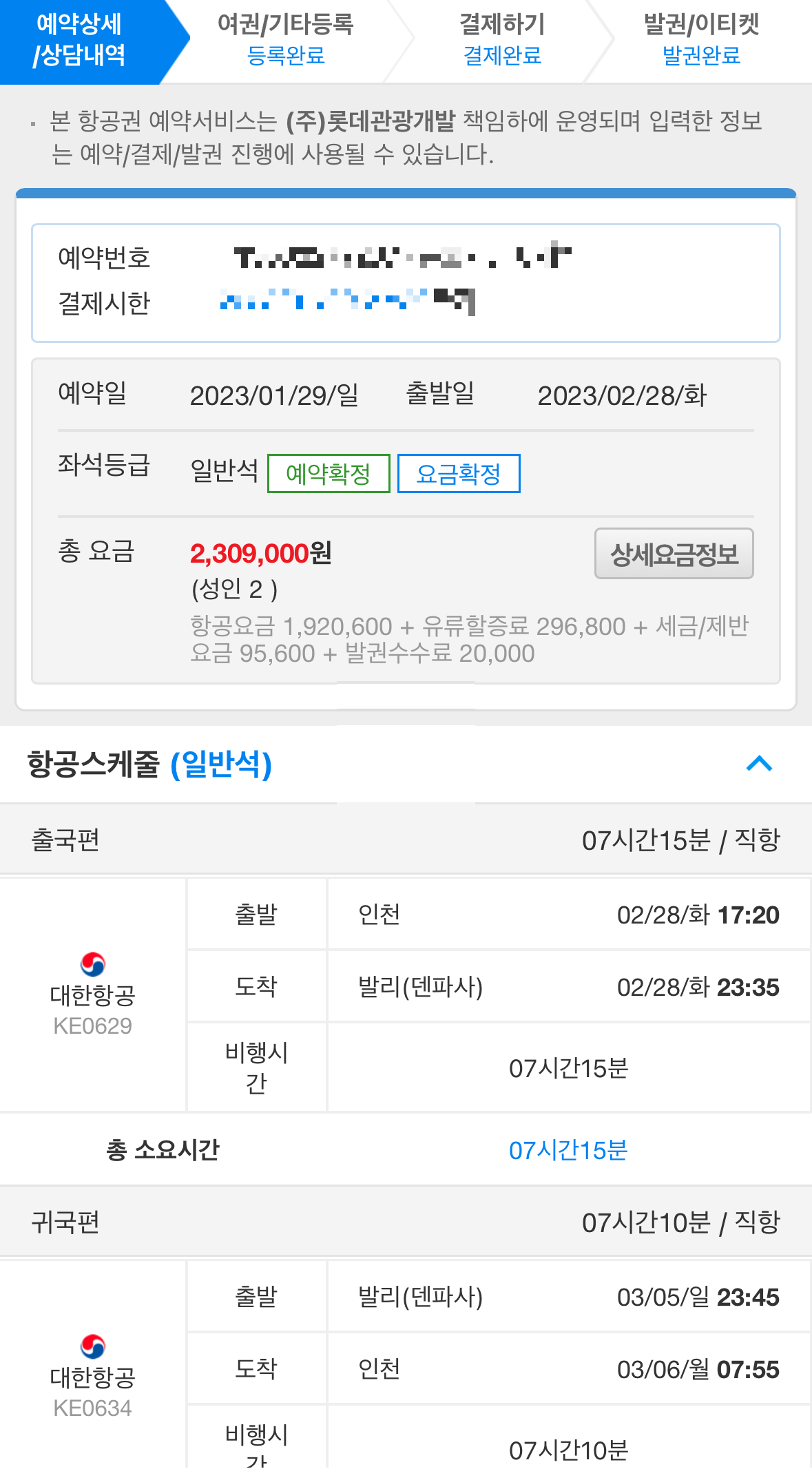 2023년 1월 19일에 예약했고, 출국은 2023년 2월 28일(입국은 2023년 3월 5일)이었다.